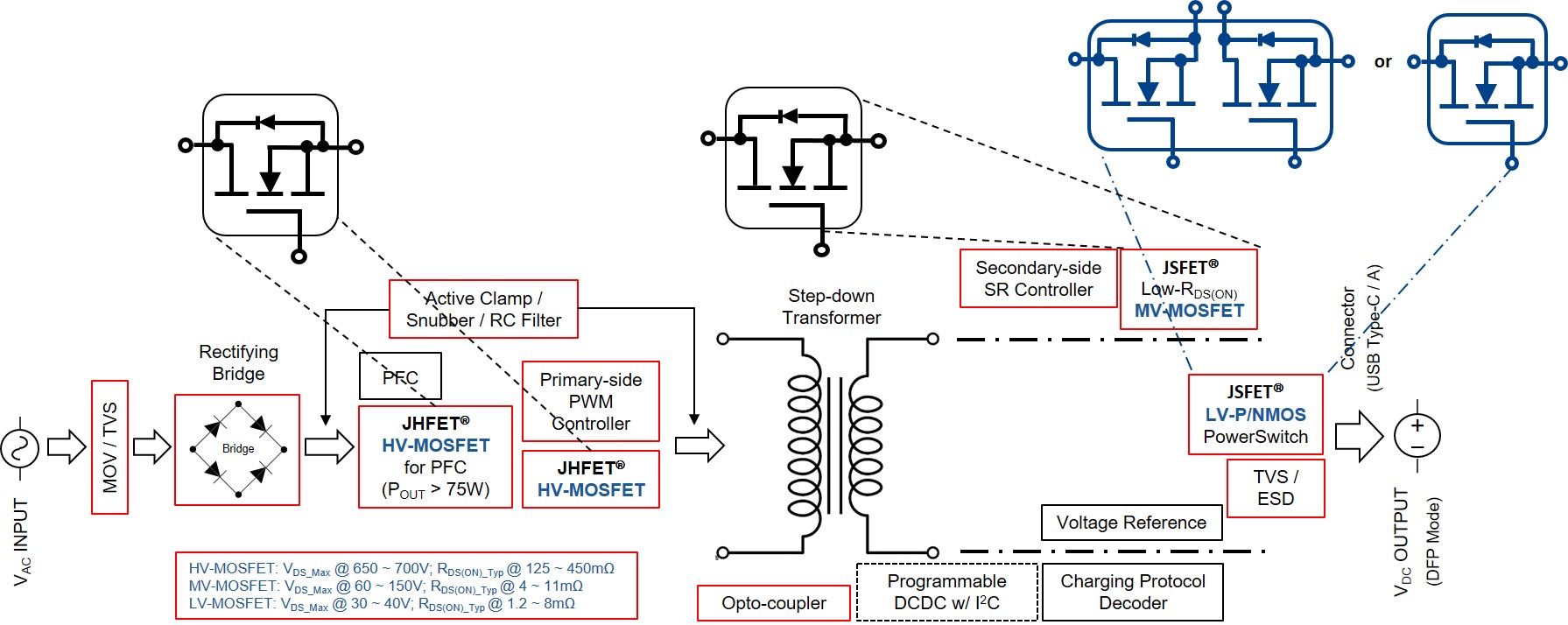 不論在原邊使用的是傳統(tǒng)的超結(jié)高壓 MOSFET、或是日益受電路設(shè)計工程師及消費(fèi)者追捧的氮化鎵 D/E-mode HEMT,在拓?fù)涞母边叄萁菸㈦娤冗M(jìn) JHFET? 技術(shù)平臺超結(jié) (super-junction) 的高壓 MOSFETs 在原邊開關(guān)、先進(jìn) JSFET? 技術(shù)平臺的中/低壓 MOSFETs 在同步整流和在 USB-C? 端口電流輸出開關(guān)等位置,都能提供穩(wěn)定可靠而高功效的運(yùn)作。 建立在 JHFET 技術(shù)平臺的 650VDS_Max SJ N-MOSFETs,導(dǎo)通阻抗 RDS(ON) 低至 169mΩ、Qg 低至 9.7nC、Ciss 低至 333pF,所有產(chǎn)品均百分百通過 UIS 測試。建立在 JSFET 技術(shù)平臺的 30 ~ 150 VDS_Max SGT N-MOSFETs,導(dǎo)通阻抗 RDS(ON) 低至 1.2mΩ、Qg 低至 7.7nC、FOM 低至 47,所有產(chǎn)品均百分百通過 UIS 測試。憑借極低的 Ciss、Coss、Crss、Qg、和卓越的安全操作區(qū)域 (SOA) 等,這些功率器件能更有效地解決在終端應(yīng)用中存在的 軟/硬開關(guān)、電感負(fù)載、EMI 等難題。能夠有如此突出的靜態(tài)和動態(tài)電氣特性,是因?yàn)榻萁菸㈦姷淖杂兄R產(chǎn)權(quán) JSFET 及 JHFET 技術(shù)平臺,各項(xiàng)工藝參數(shù)早已躋身國際一流水平。