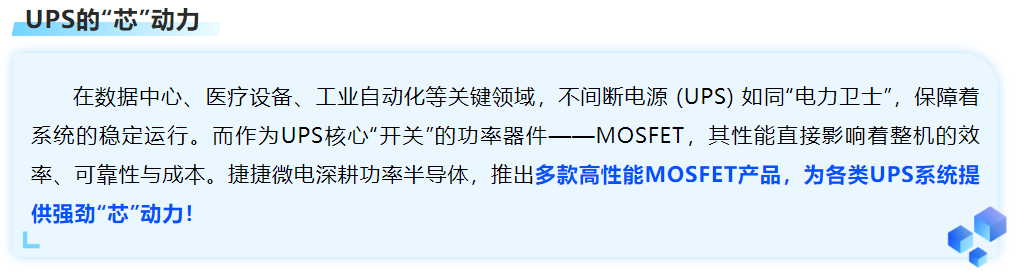 在保障關(guān)鍵設(shè)備電力安全的道路上,一顆高效、可靠的“芯”至關(guān)重要。捷捷微電持續(xù)專注于功率半導(dǎo)體技術(shù)的創(chuàng)新與突破,其UPS專用MOSFET產(chǎn)品線憑借優(yōu)異的性能參數(shù)和穩(wěn)定性,已成功應(yīng)用于各類UPS解決方案中,為客戶打造更高效、更可靠、更具成本競爭力的電源系統(tǒng)提供堅(jiān)實(shí)的“芯”保障!