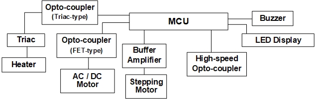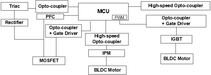 在全球氣候變暖的當(dāng)下,空調(diào)在白色家電中占有舉足輕重的地位。典型的空調(diào)系統(tǒng)由室外機(jī)、室內(nèi)機(jī)和電源單元組成。對于電源單元,捷捷微電 具有高隔離電壓光電耦合器,用于隔離 PWM 和 PFC。對于室內(nèi)機(jī),MCU 控制與光電耦合器結(jié)合的風(fēng)扇模塊、與光電三端雙向可控硅開關(guān)和外圍設(shè)備結(jié)合的加熱器開關(guān)。主隔離 MCU 和相關(guān)外圍設(shè)備,確保電路的可靠性。對于室外機(jī),使用 MCU 控制風(fēng)扇和壓縮機(jī)的電機(jī)系統(tǒng)。電機(jī)控制系統(tǒng)是各種家用電器的組成部分。每一個單獨模塊都取決于安全和環(huán)境保護(hù)要求、性能要求,當(dāng)然還有制造成本。因此,在設(shè)計家用電器時,需要加強(qiáng)對單片機(jī)和外圍設(shè)備對應(yīng)用電路的隔離,以確保電路的低噪聲。